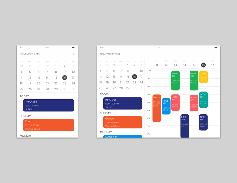 With Pear's ability to expand the phone into a tablet, our team designed a full-screen view for our calendar app. On the left side, it shows the monthly calendar with the agenda view at the bottom. On the right side, it shows the weekly time calendar; therefore, the users can know their free times.